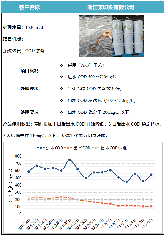 在眾多處理方法中,生物處理法是最為常規(guī)的處理方法,具有處理效率高,成本低等優(yōu)點。如浙江某一印染廢水客戶,進(jìn)水COD500mg/L到750mg/L,經(jīng)過其生化系統(tǒng)處理后,COD依舊有200mg/L到250mg/L,此時客戶選用了庫巴魯®生物技術(shù),投加了庫巴魯®COD激活菌301,3天實現(xiàn)出水COD達(dá)標(biāo),7天后穩(wěn)定在110mg/L以下,遠(yuǎn)低于其出水標(biāo)準(zhǔn)200mg/L。