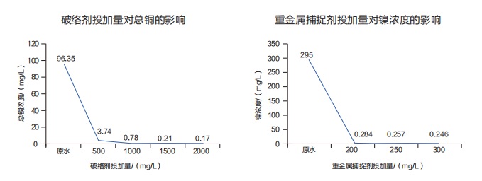 該客戶采用二級沉淀+重捕池+生化工藝,出水總銅、總鎳、總磷、總氮等均超標。經(jīng)診斷,在混凝池前端、重捕池前端和后端加入系列配套藥劑,水中銅含量降至0.21mg/L、鎳含量降至0.25mg/L、總氮穩(wěn)定于15.00mg/L,均能達標排放,出水穩(wěn)定,成本更低。
